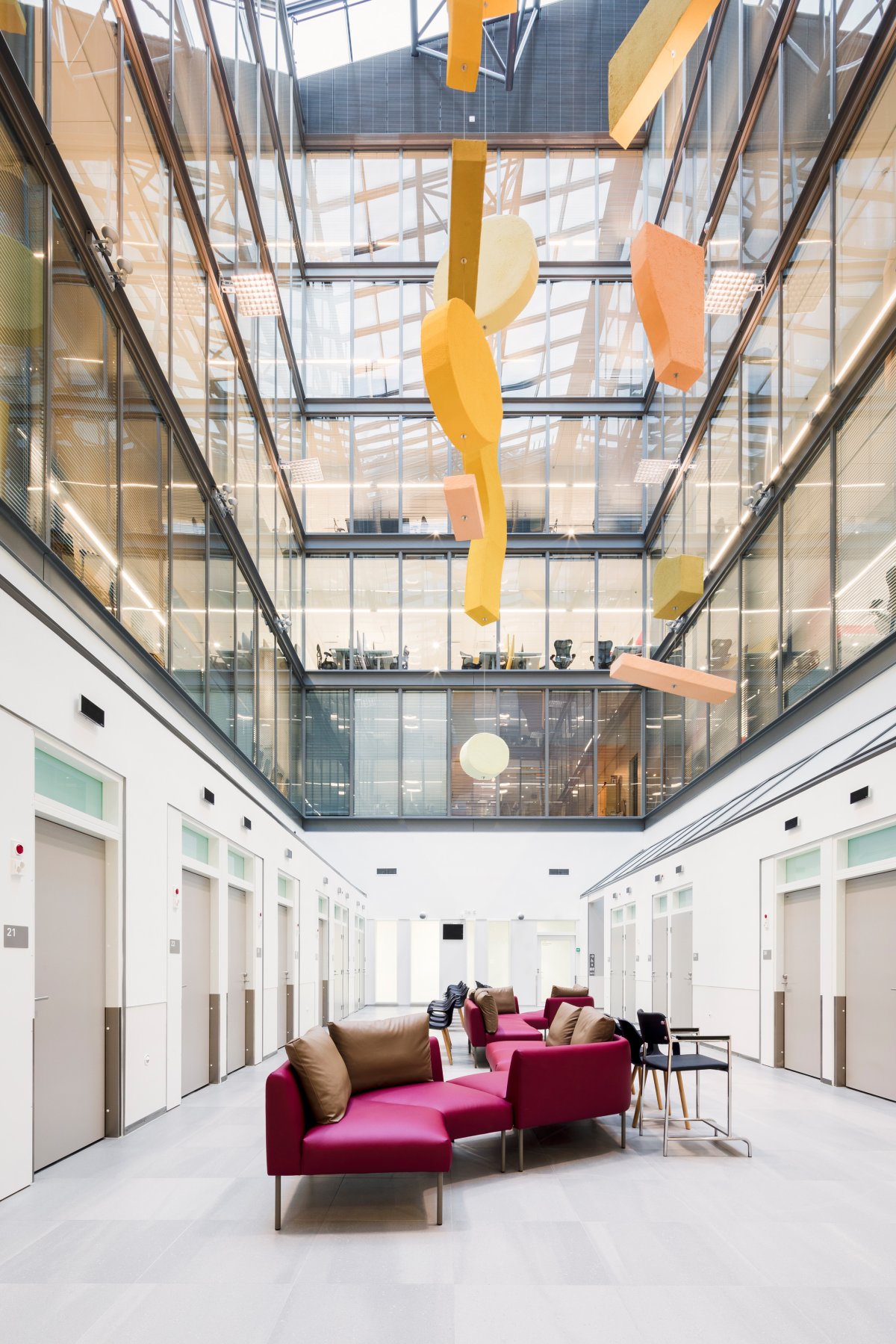 The objective was a building of public character yet approachable and open. The different coloured projections articulate and lend rhythm to the facades that are over 90 metres long. The blank areas of the ground floor are clad with slabs of natural stone. A green roof growing sedum contributes to improving air quality, assists in rainwater management and serves as an organic fifth facade towards the residential towers of the REDI centre.