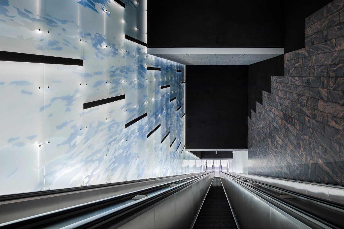 The wave patterns in the skilfully illuminated glass wall create a strong marine feel. When you turn your gaze standing on the escalator, you find a contrast in the red Mäntsälä granite glowing dimly on the opposite wall… The marine feel continues when you come to the platform level… The huge white ‘baleens’ installed over the tracks and the dark ceiling create an atmosphere of an underwater world.
