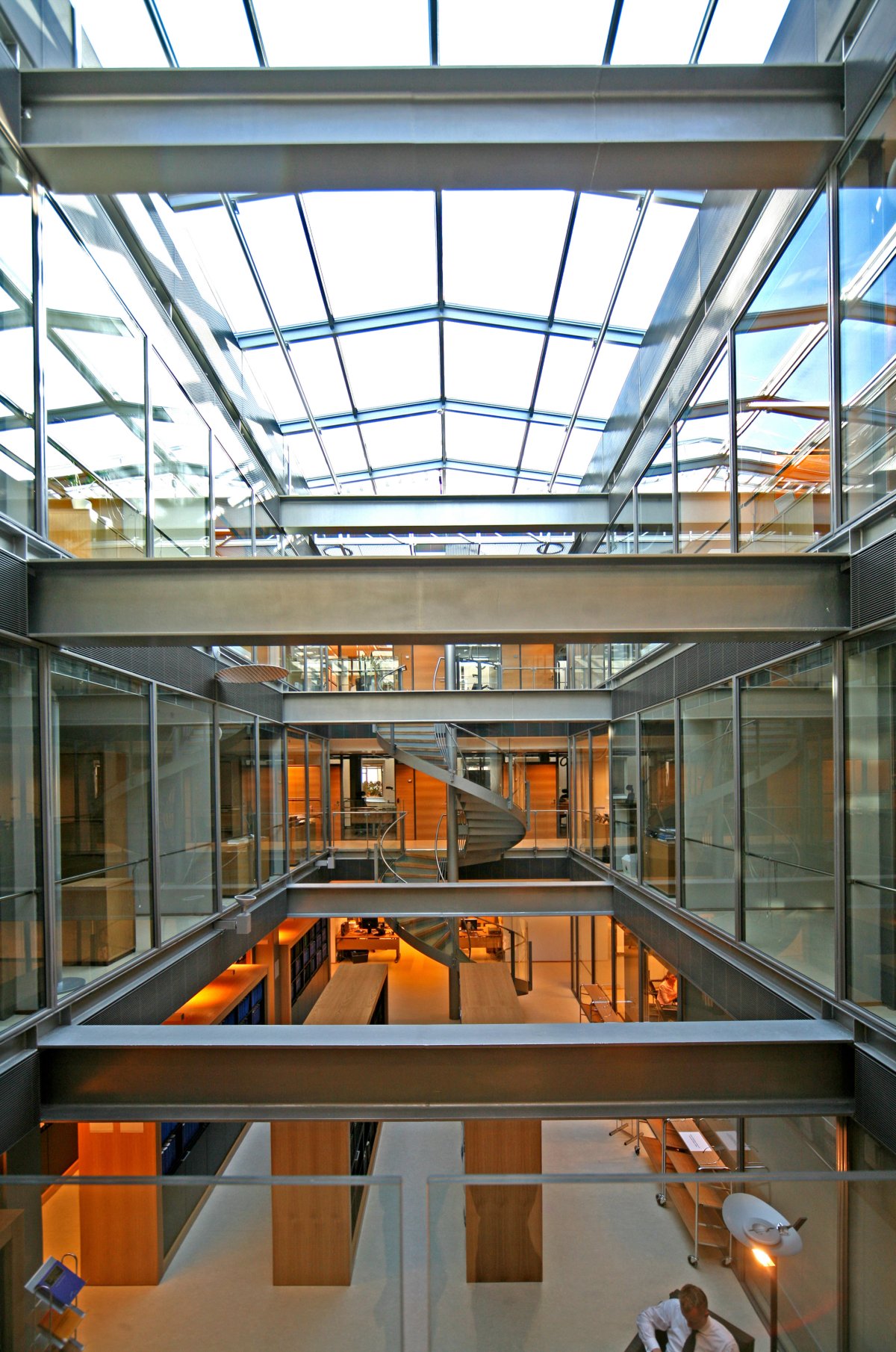 The three-storey high extension of office area was built of vierendeel frames. The loads of the new structure were led five stories down inside the wall structure of the old building, all the way to the foundation of the lower basement. In this way the theatre and its foyer could be preserved and restored without any new visible structures. The new office interior is a modern space with an interior glass wall system and light well.