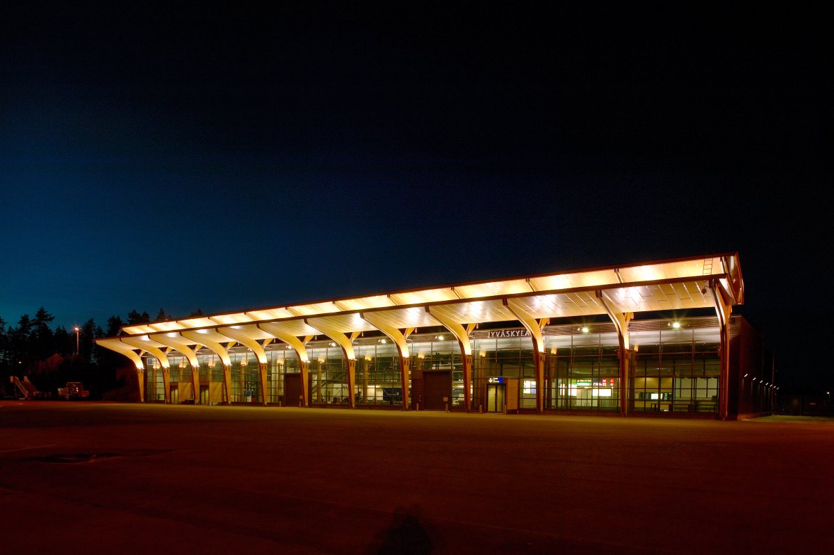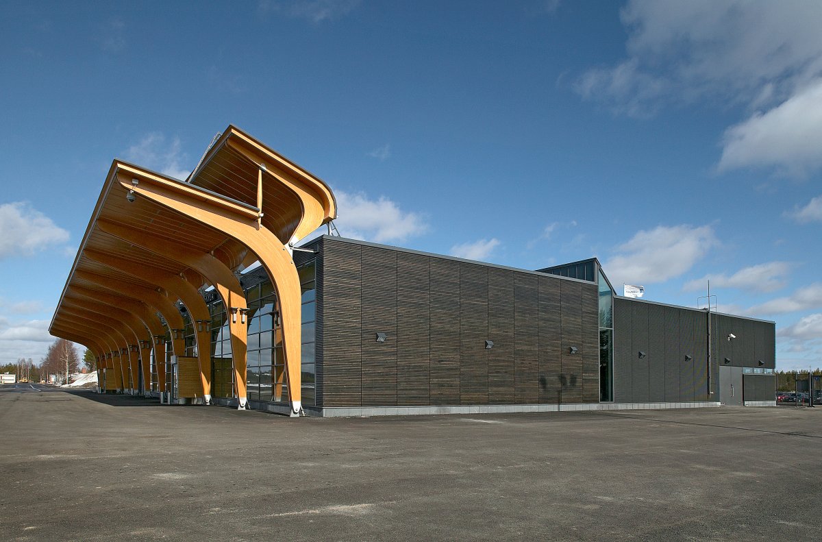 The wooden structures and materials communicate the nature of Central Finland and the long tradition of Finnish wood processing industry – and they also lend the building a local identity. The loadbearing structure of the canopy the length of the whole facade facing the airfield is made of glulam arches of planed spruce. The curving soffit is clad with birch plywood. The canopy and its details were designed with great care, in close collaboration with glulam and plywood suppliers and studying structural performance by means of partial models. The facade cladding is made of planed, heat-treated battens and the interior cladding of knotless common alder panels.