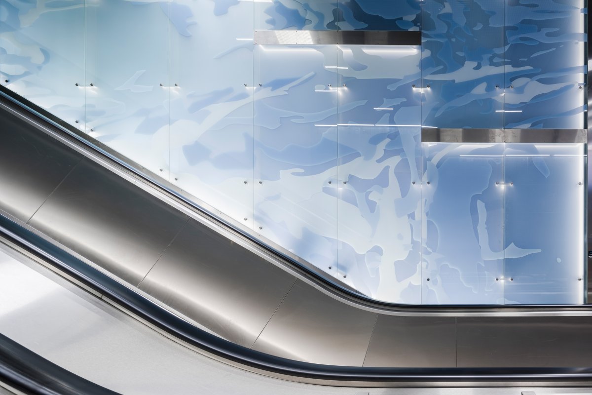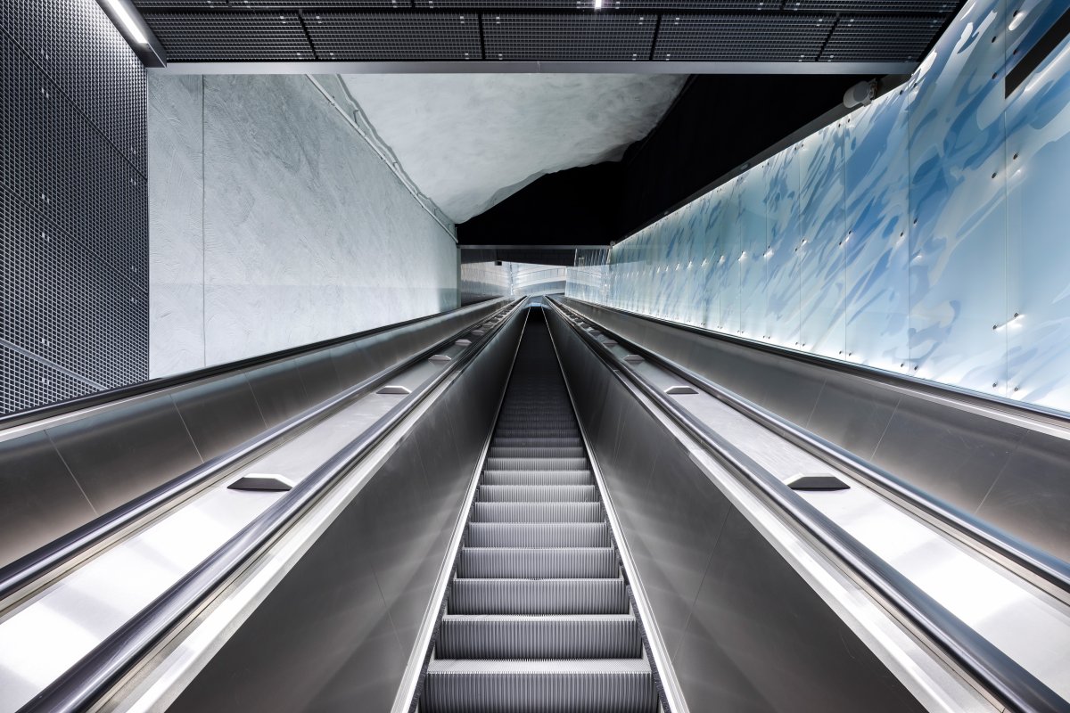 The wave patterns in the skilfully illuminated glass wall create a strong marine feel. When you turn your gaze standing on the escalator, you find a contrast in the red Mäntsälä granite glowing dimly on the opposite wall… The marine feel continues when you come to the platform level… The huge white ‘baleens’ installed over the tracks and the dark ceiling create an atmosphere of an underwater world.