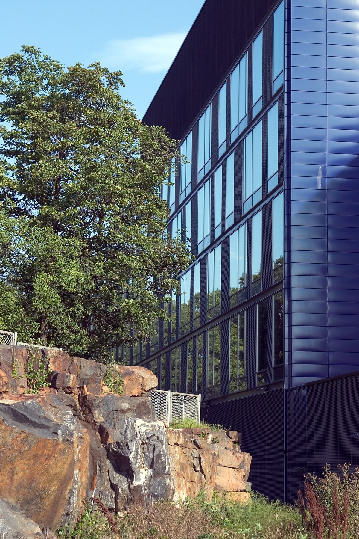 The main entrance square is at the south-western corner of the site, near the bus stops, metro station and pedestrian and bicycle routes. Car traffic is directed under the western motorway to basement parking. As a counterpoint to the busy thoroughfares, there are wide park-like areas to the east and north of the building: the Hietaniemi cemetery and the environment of the former Lapinlahti hospital by the sea.