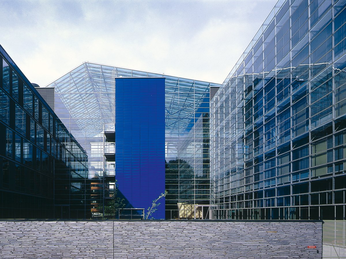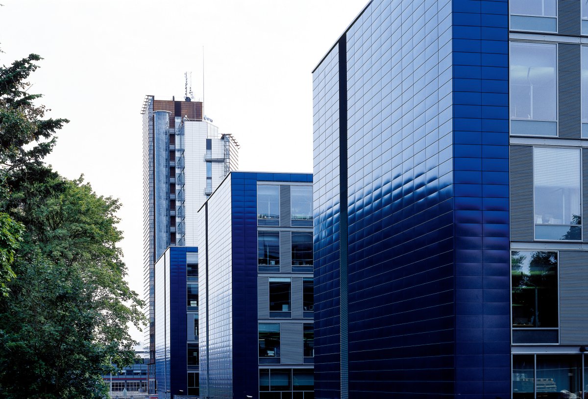 The facade materials of the building are glass and enamel-coated cobalt blue steel panels as well as corrugated steel sheets and stoved aluminium slats. The blue vertical zones of stairwells, lift shafts and building ends alternate with the steel grey horizontal office facades. The walls bordering inner courtyards and the visible walls of the driving tunnel are slate. The south and west sides have double-skin facades in order to save cooling power and abate traffic noise.