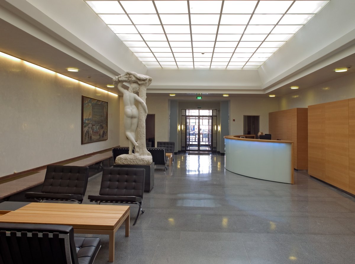 The entrance lobby retained Ole Gripenberg’s basic solution, but the walls were treated with white stucco paint and the furnishings were renewed. Sculptor Matti Haupt’s work Wood Nymph, which had received the entrants since the 1950s, followed the staff to the new premises of UPM on Alvar Aallon katu street in 2013.