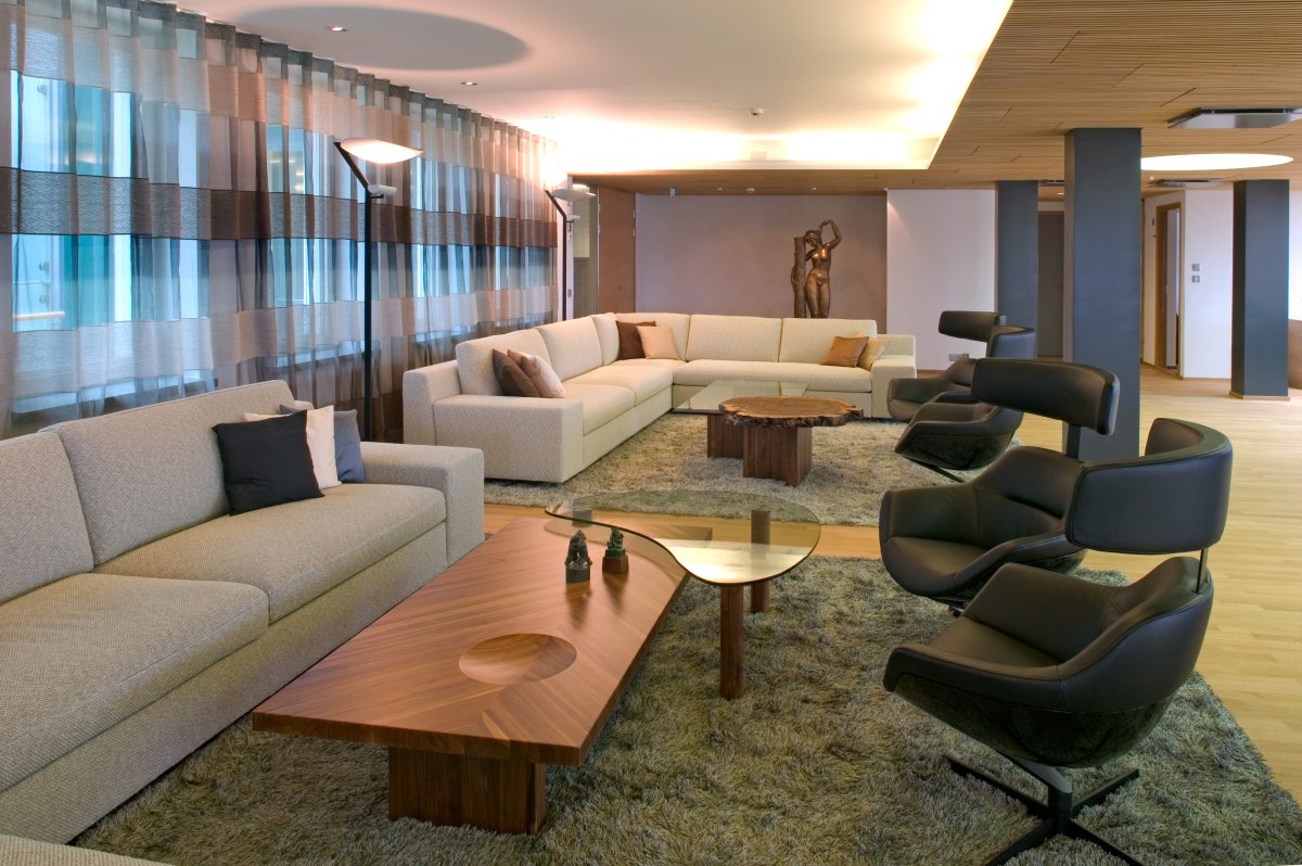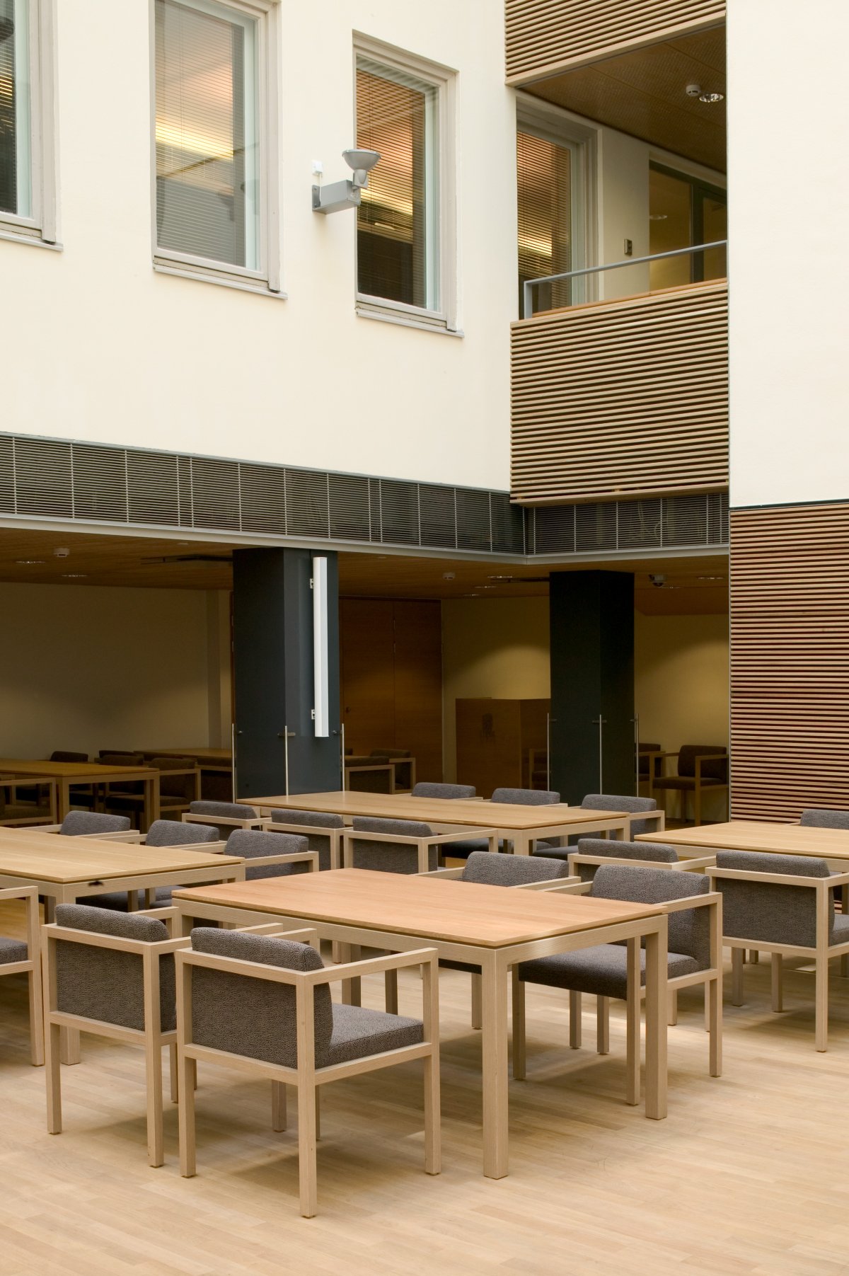 New chairs and tables were designed for the restaurant, using birch plywood for the frames and oak for surfaces. The lounge of the managing director was supplied with custom-made sofas, chairs and low tables as well as a sofa-bookcase combination that serves as a room divider. The 7th floor was furnished as the management’s meeting rooms.