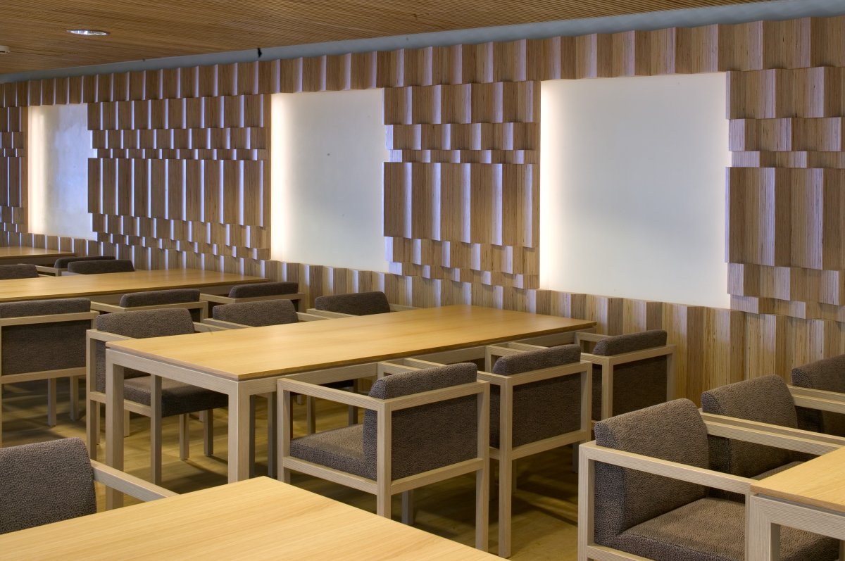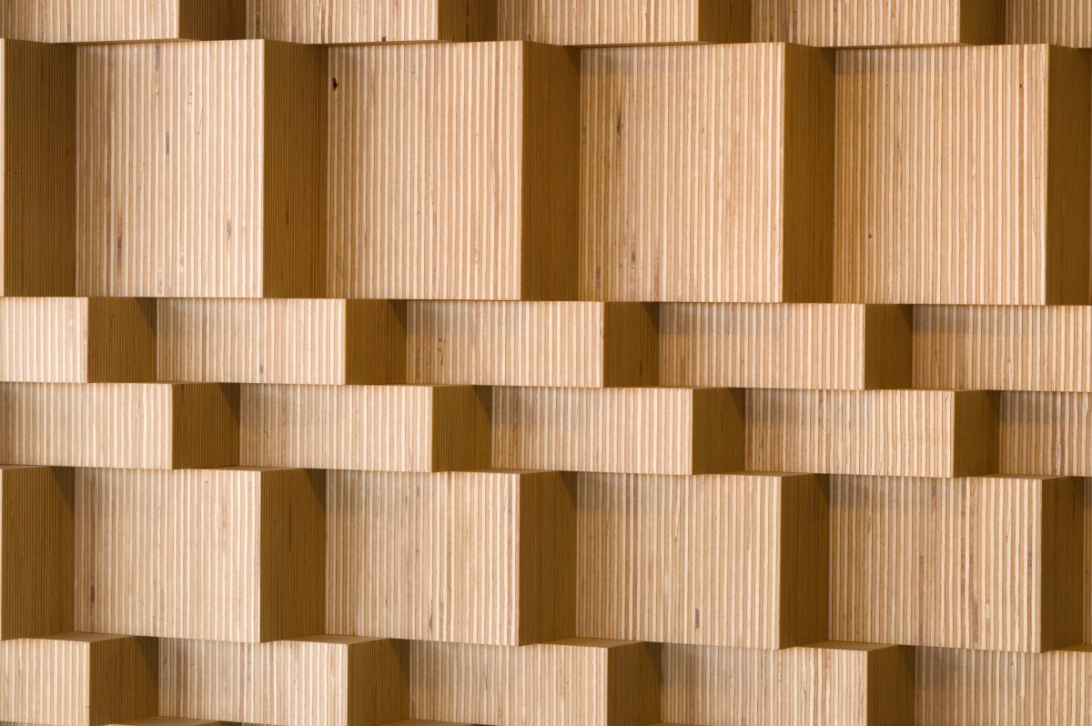 The biggest change occurred in the inner courtyard, which was altered into a 9-storey high glass-covered atrium. UPM’s wood products were used in all spaces innovatively and as largely as possible. A wall in the staff restaurant was clad with a relief made of 70-mm thick cross-bonded plywood board. The boards were sawn at a 45-degree angle into triangular parts, which were assembled into a three-dimensional wall cladding. It would be possible to adapt this solution for wider production of acoustic cladding.