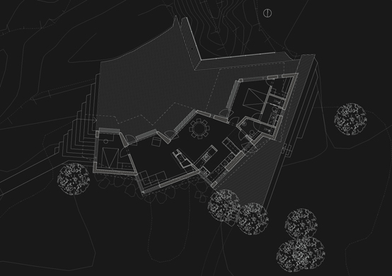 The geometry of the building relates to the forms of the bedrock with its varied colours and glaciated grooves. Larch, which naturally weathers silvery grey, clads the exterior, while sedum changes from green to brown on the roof during the summer. Exposed fans of laminated beams and columns form the structure. Inside, cladding is warm pine with paler ash flooring, making a welcoming cave in the wilderness.