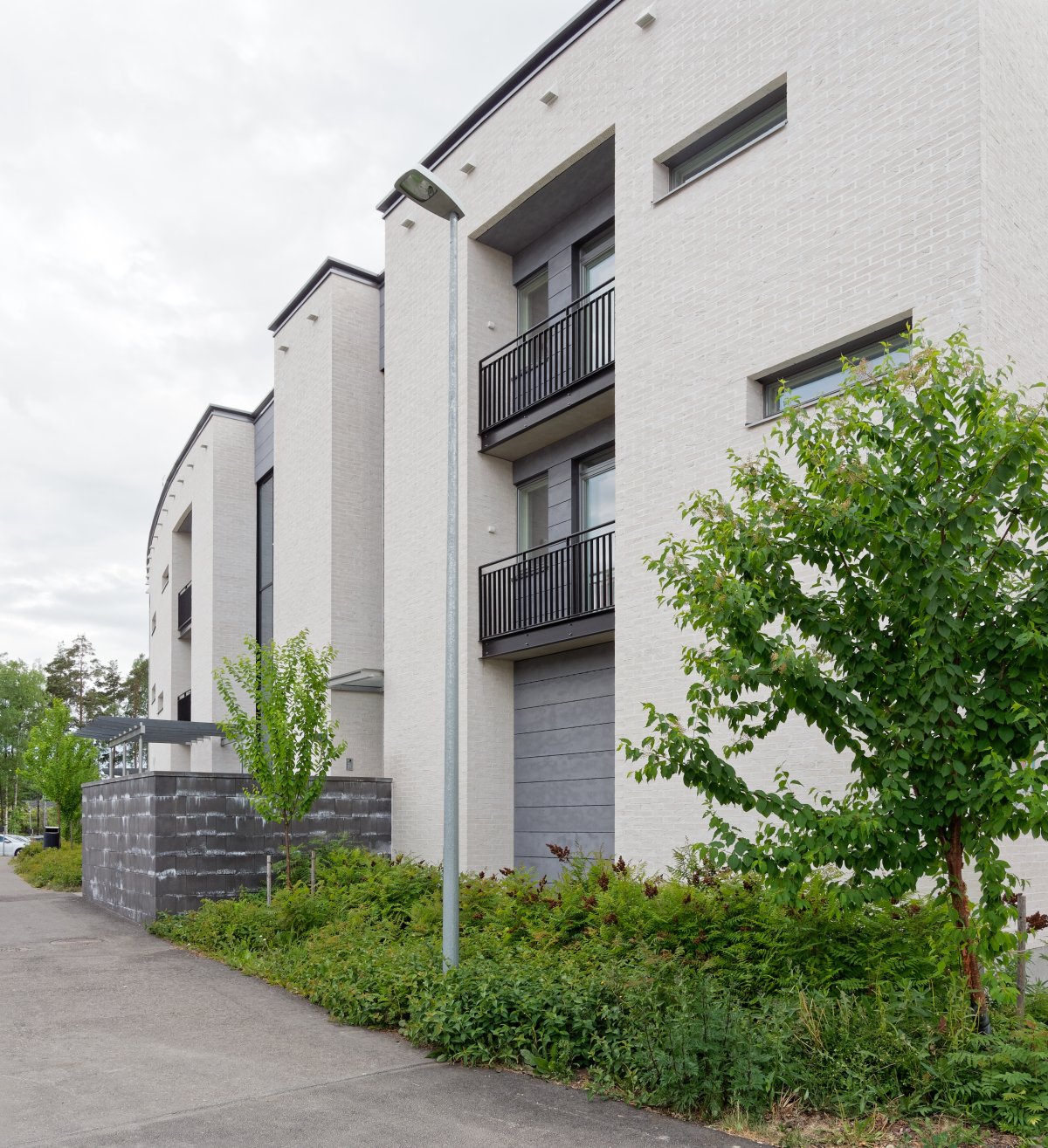 The frames of the buildings are concrete and the facades mainly off-white fair-faced brick laid on site, with small areas of greyish brown fibre cement sheeting. The steel elements have brownish black paint finish and the glazings are clear. Wood with greyish brown transparent coating appears in top-floor terraces and canopies as well as in courtyard fences and pergolas.